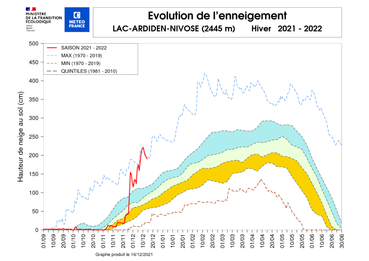 Sur les Pyrénées, à Piau, 1 860 m d'altitude, 1,70 m de neige, le 11 décembre 2021, la plus forte épaisseur de neige depuis 40 ans pour ce poste d’observation nivo-météorologique.