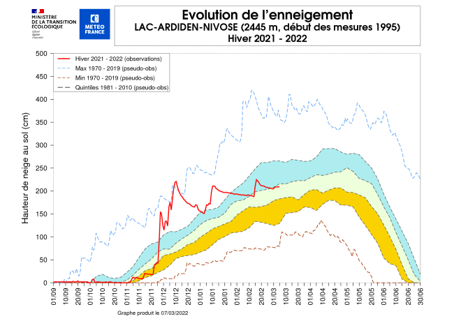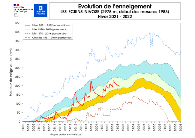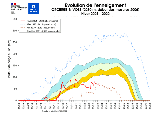 08/03/2022L’hiver météorologique qui couvre les mois de décembre, janvier et février s’est terminé, et l’heure est au bilan de l’enneigement du cœur d’hiver sur nos massifs, bilan qui est temporaire car la fin de l’hiver météorologique ne rime pas avec maximum de l’enneigement. Notamment en altitude, ce maximum d’enneigement est plutôt atteint en avril/mai et est d’autant plus tardif que l’altitude est élevée… et que la fin de saison sera froide et perturbée ou non – la preuve la plus récente en est le printemps 2021, extrêmement neigeux en altitude.