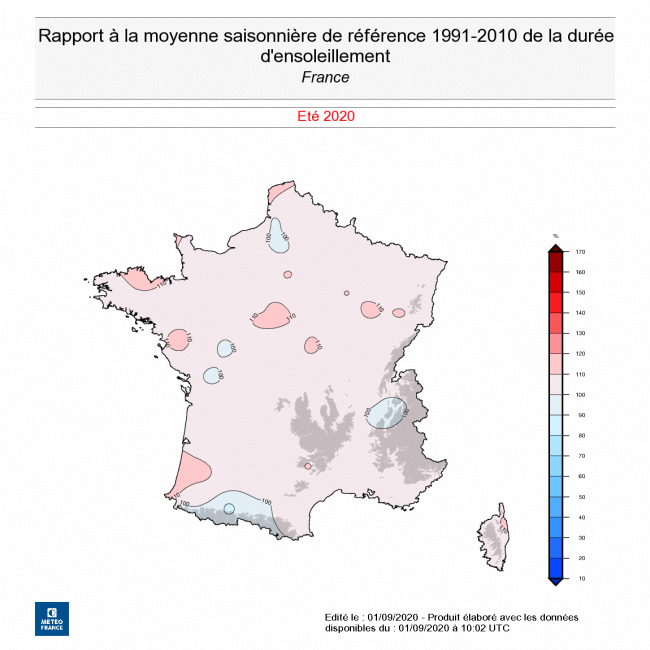 L’ensoleillement a été proche de la normale ou légèrement excédentaire sur une grande partie du pays. L’excédent a souvent dépassé 10 %, du Centre-Val de Loire à l’Alsace, sur le sud du Massif central et plus localement sur l’extrême nord du pays, la façade ouest et la Corse.