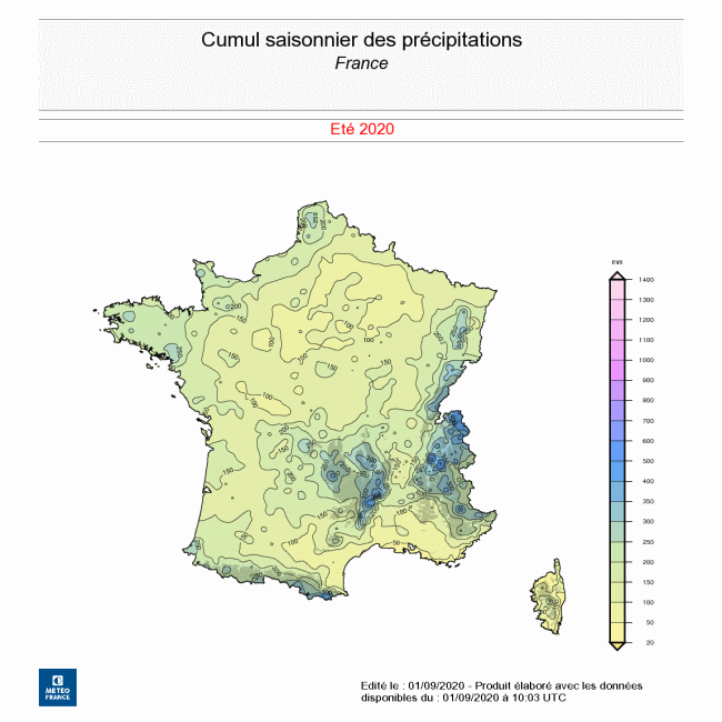 Les passages perturbés, fréquents en juin sur une grande partie du pays, ont ensuite été quasi absents, excepté en août, des côtes de la Manche au nord de la Nouvelle-Aquitaine. Les précipitations, excédentaires sur le Cotentin, de la Bretagne à la Vendée ainsi que sur le sud du Massif central et l’extrême sud-est, ont été déficitaires sur le reste du pays. Le déficit a souvent dépassé 50 % sur un grand quart nord-est et plus localement de l’Occitanie à l’ouest de la Provence et en Corse. Sur le Grand-Est, la Bourgogne - Franche-Comté et l’Occitanie, le cumul moyen des précipitations des mois de juillet et août est à ce jour le plus faible enregistré sur la période 1959-2020. Le déficit pluviométrique, associé à des températures élevées, a contribué à la poursuite de l’assèchement des sols tout au long de l’été sur un grand quart nord-est. En moyenne sur la France, la pluviométrie a été déficitaire de près de 15 %.