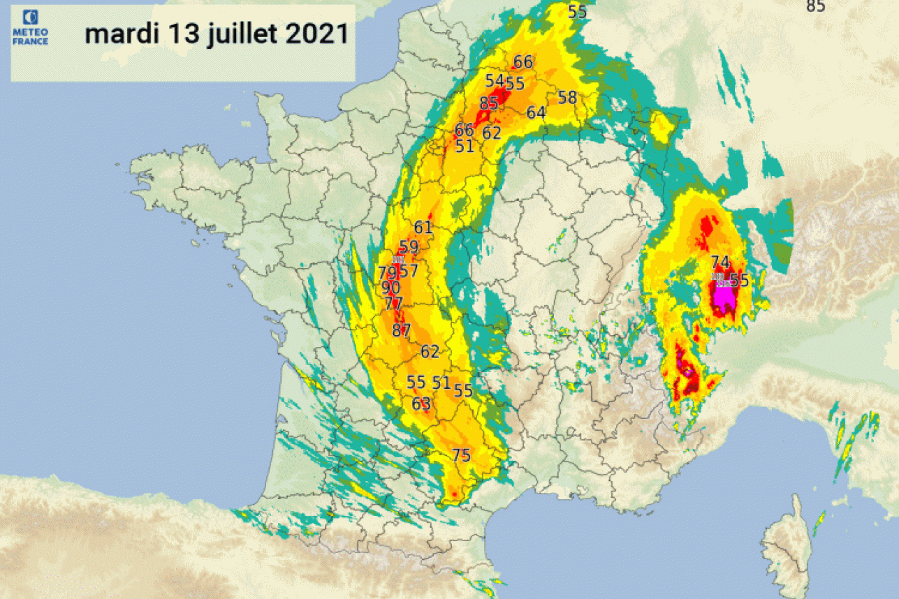 À ces cumuls, s'ajoutent aussi ceux de la veille (13 juillet) presque sur les mêmes zones géographiques :