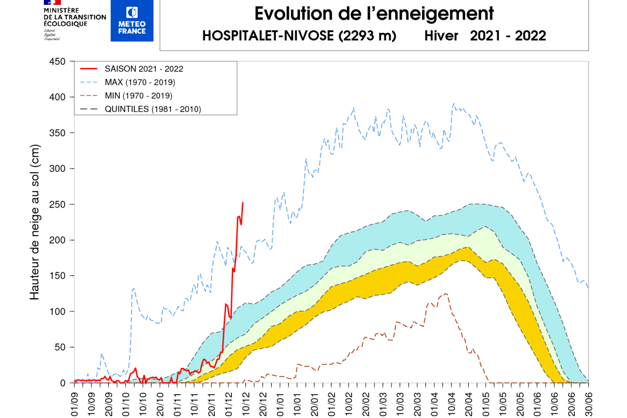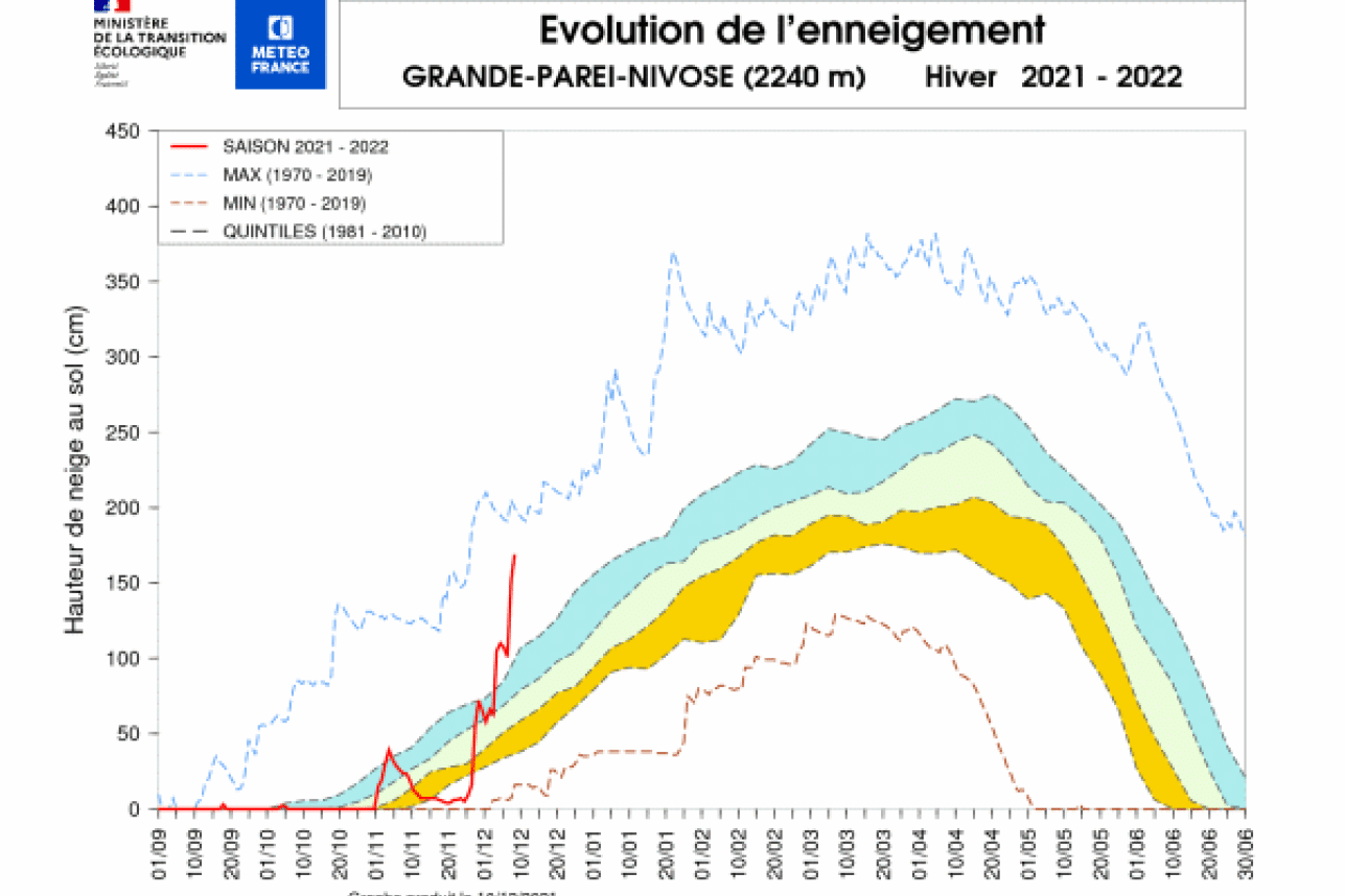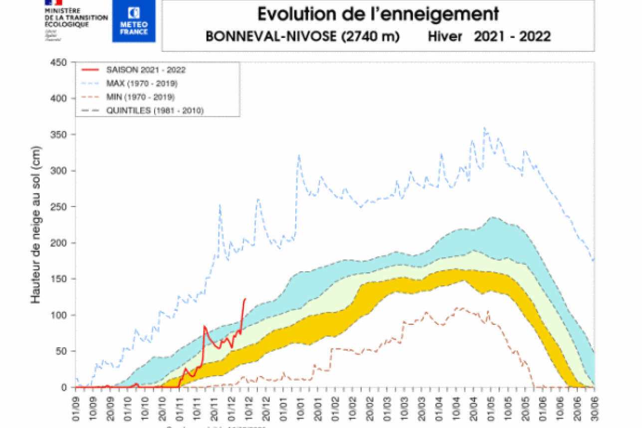- ainsi à Chamonix avec près de 70 cm, ce 10 décembre 2021, se situe en seconde position des valeurs de hauteur de neige totale, les plus élevées depuis 1959, le record étant de 85 cm le 10 décembre 1965, (3e position avec 62 cm pour le 10 décembre 2012) ;