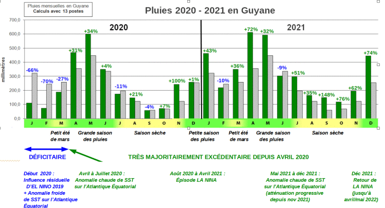 Cet épisode de précipitations intenses arrive dans un contexte aggravant. En effet, après une année 2021 remarquablement pluvieuse, la petite saison des pluies passée a été extrêmement arrosée, avec une zone de convergence intertropicale généralement très proche de la Guyane, avec des pics d’activité fréquents, cela s’est traduit par un mois de février exceptionnel, enfonçant le clou après un mois de janvier déjà copieusement arrosé autour de l’Île de Cayenne.