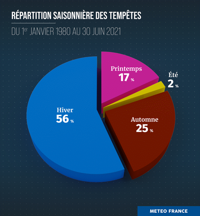 En termes de sévérité, si l’on prend les 25 tempêtes majeures qui ont touché la métropole de 1980 à juin 2021, seules 5 n’ont pas eu lieu en période hivernale (hiver météorologique du 1er décembre au 31 mars).