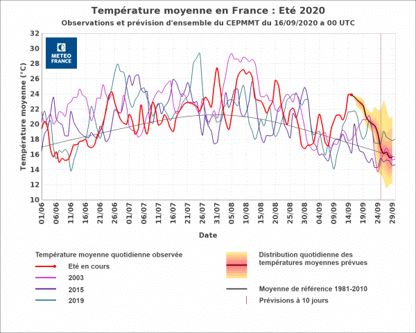 Du 13 au 16 septembre, l’indicateur thermique national des températures maximales a dépassé les 30 °C, soit une série de 4 jours de chaleur consécutifs jamais mesurée auparavant en septembre.