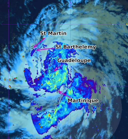 Le centre de la tempête tropicale ERNESTO traverse actuellement la Guadeloupe générant de fortes précipitations orageuses et des vents maximums de 90 km/h. Ses impacts se feront sentir sur l'Arc antillais jusqu' en fin de nuit de mardi à mercredi.