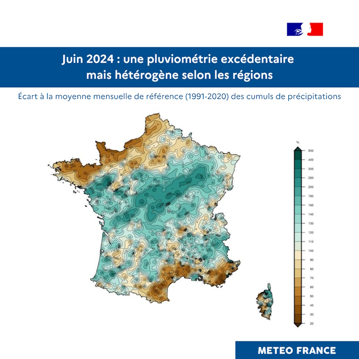 La pluviométrie a une nouvelle fois été excédentaire à l’échelle du pays (+20 % par rapport aux normales 1991-2020 ; +60 % en mai). Mais elle est hétérogène selon les régions :