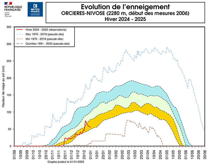 L’enneigement en fond de vallée de la moyenne montagne est de l’ordre de 15 à 30 cm à 1 500 m dans les Hautes-Alpes, sauf le Queyras. Dans les massifs plus au Sud, on retrouve 5 à 10 cm, mais les Alpes-Maritimes ne sont pas enneigées à cette altitude. À la Nivôse Millefonts à 2 430 m d’altitude, une valeur de 4 cm est enregistrée. Elle est la 2e plus faible en dix-huit ans de mesures – le plus faible enneigement datant de l’hiver 2015/2016.
