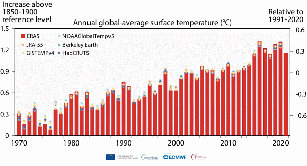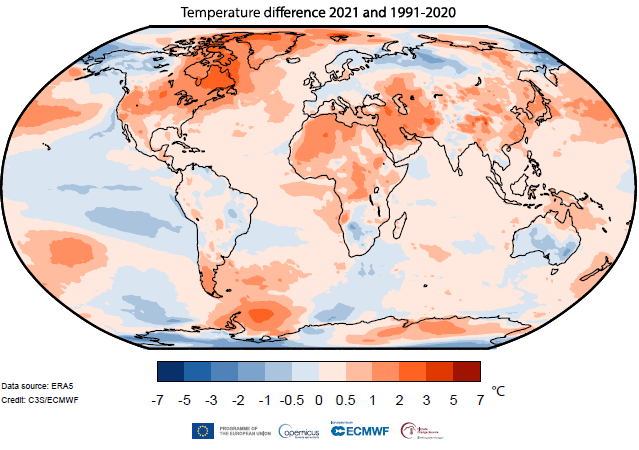- À l'échelle mondiale, 2021 a été la cinquième année la plus chaude jamais enregistrée, mais seulement marginalement plus chaude 2015 et 2018, selon le service européen Copernicus sur le changement climatique (C3S).