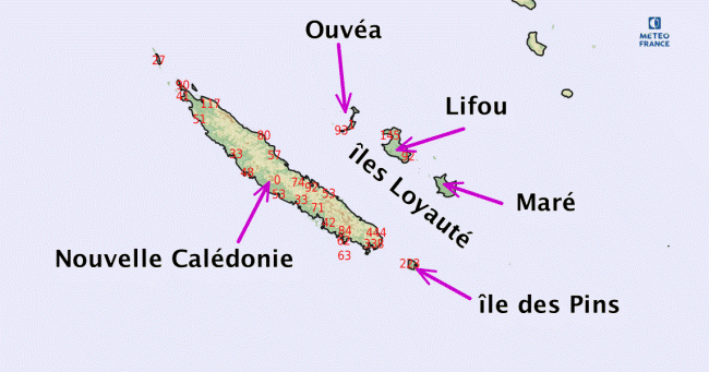 - 20 à 100 mm en 12 heures sur le reste de la Grande Terre et des îles Loyauté.