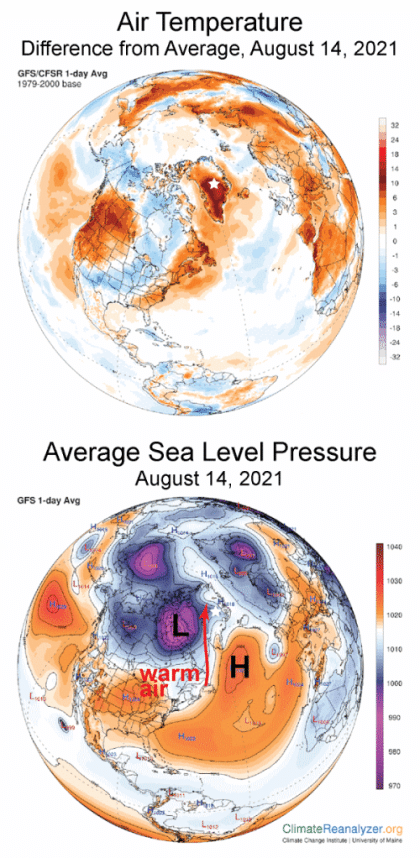 C'est seulement la troisième fois, en moins d'une décennie, que la station « Summit » de la « National Science Foundation » a enregistré des températures au-dessus du point de congélation et de la neige mouillée. La température est restée positive pendant 9 heures. Mais la pluie n’avait jamais été observée précédemment à cet endroit, situé à plus de 72 degrés de latitude Nord, et culminant à 3 216 mètres d'altitude ! Cette observation de gouttelettes de pluie a été attestée par les observateurs sur place. Comme l’épisode majeur de fonte de la fin juillet, c’est une puissante dépression au-dessus de l'île de Baffin et des hautes pressions au sud-est du Groenland qui ont contribué à pousser de l'air chaud et l'humidité rapidement à partir du sud :