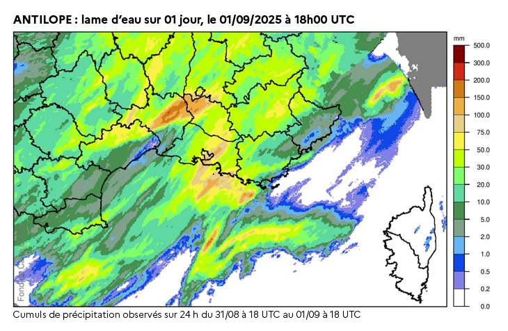 La carte ci-dessous montre une estimation des cumuls de précipitation sur 24 heures entre le 31 août (à 20 h locales) et le 1er septembre (à 20 h locales), à partir du croisement des données de lame d’eau radar (estimation des cumuls de pluies au sol) et de pluviomètres.