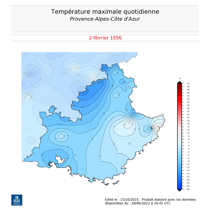 Dans des situations extrêmes, quand une vague d’air froid déferle de Sibérie vers l’Europe occidentale, les températures maximales sont particulièrement basses et l’accélération du mistral dans le couloir rhodanien conduit à des ressentis qui peuvent être aussi bas que dans les régions continentales de l’est de la France. Ainsi, le 2 février 1956, les températures maximales étaient de -10 °C à Orange, -8 °C à Marseille Marignane, des valeurs qui correspondent à 20 degrés sous les normales saisonnières actuelles (calculées sur la période 1991-2020). Avec le mistral qui soufflait ce jour-là en rafales entre 100 et 160 km/h, le ressenti pouvait descendre sous les -20. Même si une telle situation semble très peu probable dans notre climat actuel, il n’en reste pas moins que le mistral peut surprendre en apportant parfois des sensations bien hivernales jusqu’au littoral provençal.