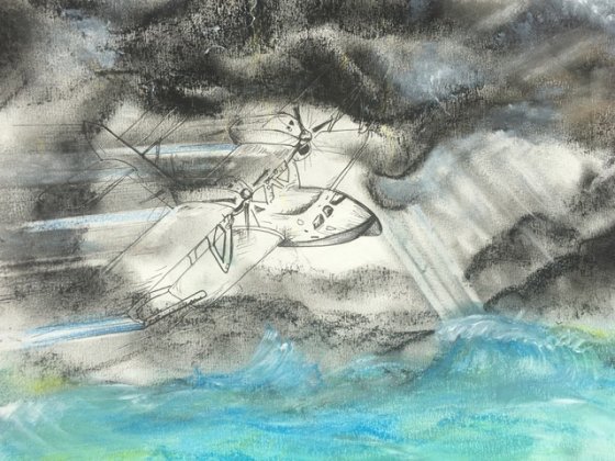 " Tout l'horizon était noir, une sorte de mur gigantesque paraissait barrer notre route ", écrit Mermoz. " Au milieu de ce cyclone, une sorte de tornade sans vent, il faisait une chaleur étouffante. Nous n'avons pu éviter des grains d'une violence inouïe, qui dégageaient une chaleur plus forte encore que celle des bains de vapeur. Tout à coup, sans que nous ayons pu nous méfier, notre cabine, de l'avant à l'arrière, baigna dans l'eau. Nous étions inondés ". En volant à 50 mètres au-dessus des vagues, l'hydravion de Mermoz parvint à traverser le Pot-au-noir. Le 13 au matin, un peu plus de 21 heures après son départ, Mermoz posait délicatement l'hydravion sur le rio Potengi, près de Natal au Brésil.
