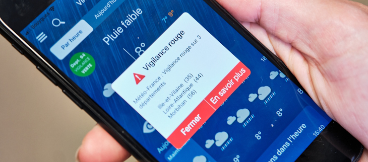 L'application de Météo-France permet de s'abonner à des notifications (passage en Vigilance orange et rouge) pour le ou les département·s de son choix (à configurer via le menu Paramètres/notifications).