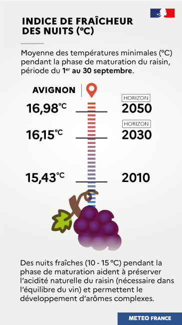 À Avignon, la moyenne des températures minimales pendant la phase de maturation du raisin, période du 1er au 30 septembre, était de 15,43 °C en 2010. Elle devrait être de 16,15 °C à l'horizon 2030 et de 16,98 °C à l'horizon 2050.