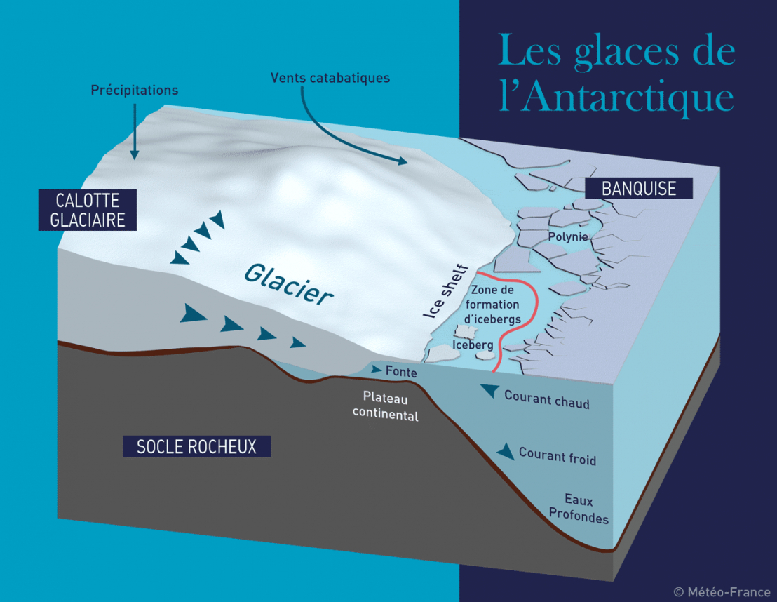 • Iceberg : morceau de glace (eau douce) dérivant sur la mer. Détachés des glaciers atteignant la mer ou des ice shelves, leur partie émergée représente 10 % seulement de leur volume total. Les icebergs antarctiques peuvent être de très grandes dimensions : en 2000, un iceberg de 11 000 km² – plus grand que la Corse – s'est détaché de la plate-forme de Ross !