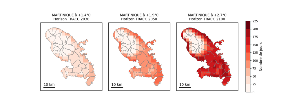 Les projections climatiques mises à disposition par Météo-France permettent d’analyser, à une échelle fine de 3 km, les évolutions possibles du climat dans les Antilles selon les niveaux de réchauffement de la Trajectoire de réchauffement de référence pour l’adaptation au changement climatique (TRACC).